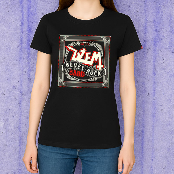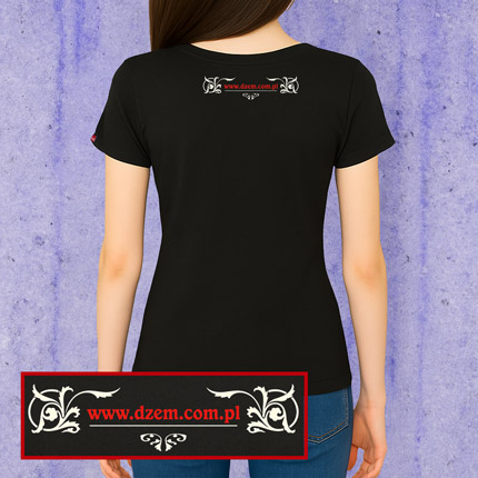 Czarna koszulka z oryginalnym nadrukiem z przodu oraz adresem strony internetowej zespołu z tyłu. Wersja damska.