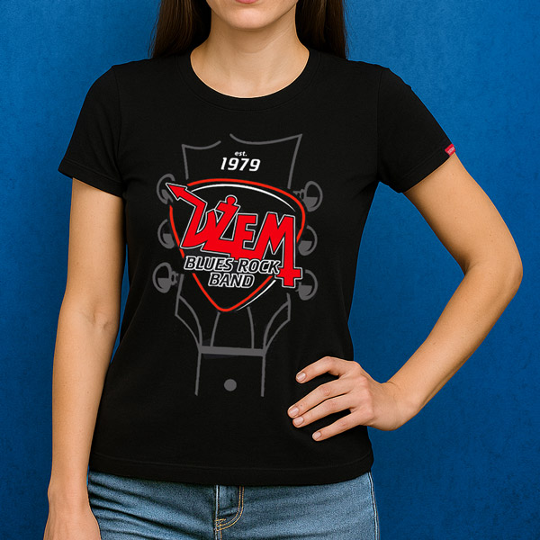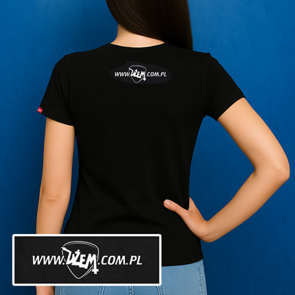 Czarna koszulka z nadrukiem z przodu oraz adresem strony internetowej zespołu z tyłu. Wersja damska.